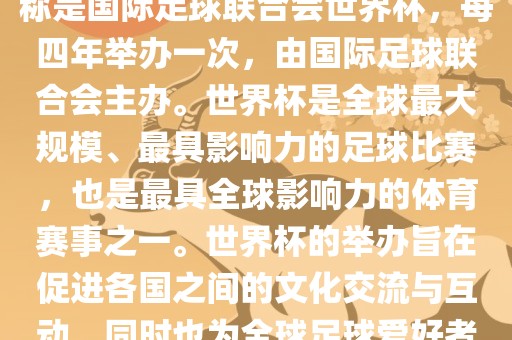 世界杯是一项国际足球赛事,全称是国际足球联合会世界杯,每四年举办一次,由国际足球联合会主办。世界杯是全球最大规模、最具影响力的足球比赛,也是最具全球影响力的体育赛事之一。世界杯的举办旨在促进各国之间的文化交流与互动,同时也为全球足球爱好者带来一场精彩的足球盛宴。