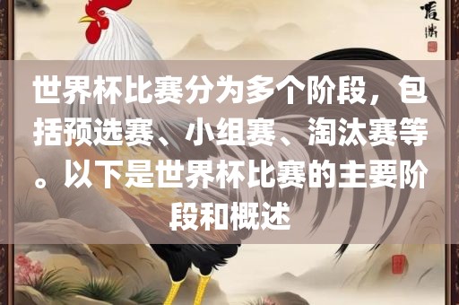 世界杯比赛分为多个阶段,包括预选赛、小组赛、淘汰赛等。以下是世界杯比赛的主要阶段和概述