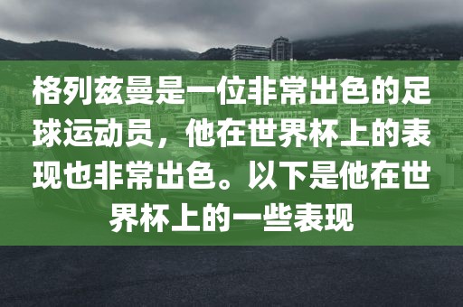 格列兹曼是一位非常出色的足球运动员,在世界杯赛场上上的表现也非常出色,他的出色表现和进球能力帮助法国队赢得了多个荣誉和胜利,成为球队中不可或缺的一员。