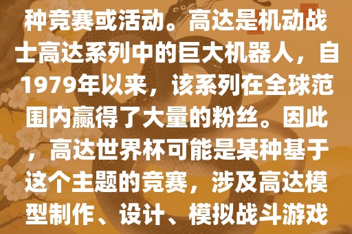 为了获取关于“高达世界杯”更具体的信息,您可以尝试在社交媒体平台上搜索相关话题,或者查看与高达相关的官方网站和论坛,不过截至当前时间,我并没有具体关于“高达世界杯”的详细信息,如果您想了解具体的活动情况,建议访问相关社区获取最新和详细的信息。