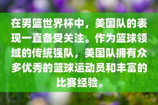 值得注意的是,美国队在男篮世界杯中的表现和成绩不仅取决于球队的整体实力和状态,还受到诸多因素的影响,如对手实力、比赛环境、球员伤病等,无法简单地预测美国队在男篮世界杯中的表现。