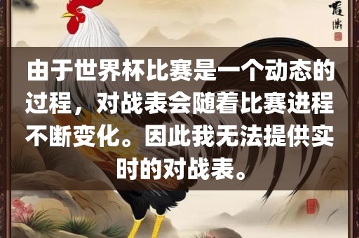 摘要:由于世界杯比赛是一个动态的过程,对战表会随着比赛进程不断变化,因此无法提供实时的对战表。需要关注比赛进程以获取最新的对战信息。