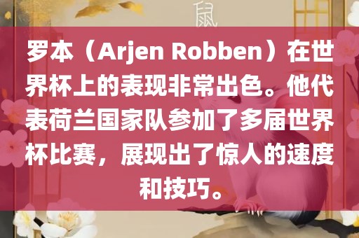 罗本在世界杯上的最佳表现之一是在2010年南非世界杯上,他作为荷兰国家队的核心球员之一,帮助球队在比赛中取得了出色的成绩,在那届比赛中,罗本以其惊人的速度和突破能力成为了球队进攻端的重要武器,并在多场比赛中为球队创造了很多进球机会。