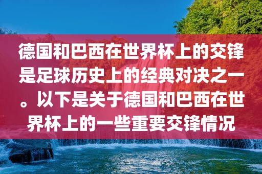 德国和巴西在世界杯上的交锋是足球历史上的经典对决之一。以下是关于德国和巴西在世界杯上的一些重要交锋情况