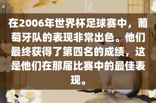 在2006年世界杯足球赛中,葡萄牙队表现出色,最终获得第四名的成绩,创造了该队在比赛中的最佳表现。他们的表现令人印象深刻,展现出强大的实力和潜力。