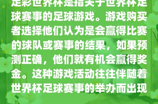 摘要:足彩世界杯是一种基于世界杯足球赛事的足球游戏,玩家通过预测比赛结果来参与游戏,有机会赢得奖金。这种游戏活动通常伴随着世界杯足球赛事的举办而出现,玩家可以选择他们认为会获胜的球队或赛事结果。