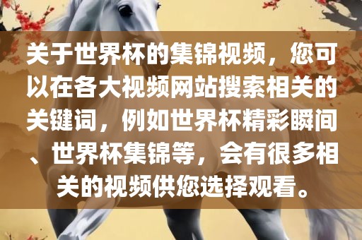 这些集锦视频通常会包括各种精彩进球、绝杀瞬间、感人瞬间、球员表现等内容,让您重温世界杯的激情和感动,建议您选择高清、有解说或者评论的视频,这样能够更好地理解和感受比赛的精彩之处。