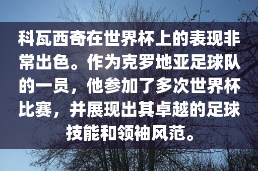 科瓦西奇在世界杯上的表现引人注目。作为克罗地亚足球队的核心球员,他多次参加世界杯比赛,凭借出色的足球技艺和领袖气质,为球队贡献了关键力量。他的表现充分展现了世界级球员的实力和潜力。