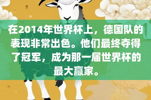 德国队在2014年世界杯上表现出色,最终夺得冠军,成为该届赛事的最大赢家。他们在比赛中的表现令人印象深刻,充分展现了实力和战术素养。这一成就让德国队在足球世界中再次崭露头角。