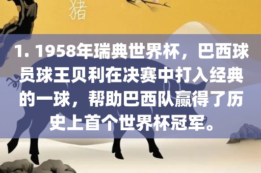 1. 1958年瑞典世界杯,巴西球员球王贝利在决赛中打入经典的一球,帮助巴西队赢得了历史上首个世界杯冠军。