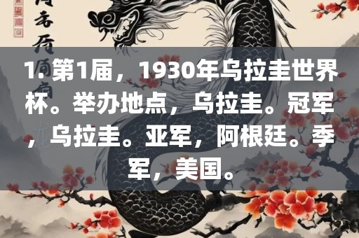 1. 第1届,1930年乌拉圭世界杯。举办地点,乌拉圭。冠军,乌拉圭。亚军,阿根廷。季军,美国。